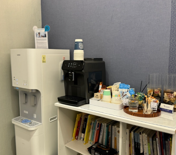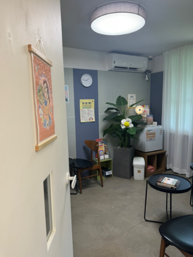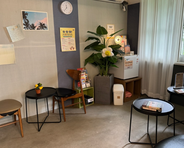 이 곳은 센터를 방문한 여러분들을 위한 공간이에요. 차를 마시면서 이야기를 나누거나 책을 읽을 수 있어요! 대기실 안 냉장고에 음료도 채워뒀으니 마음껏 드세요~