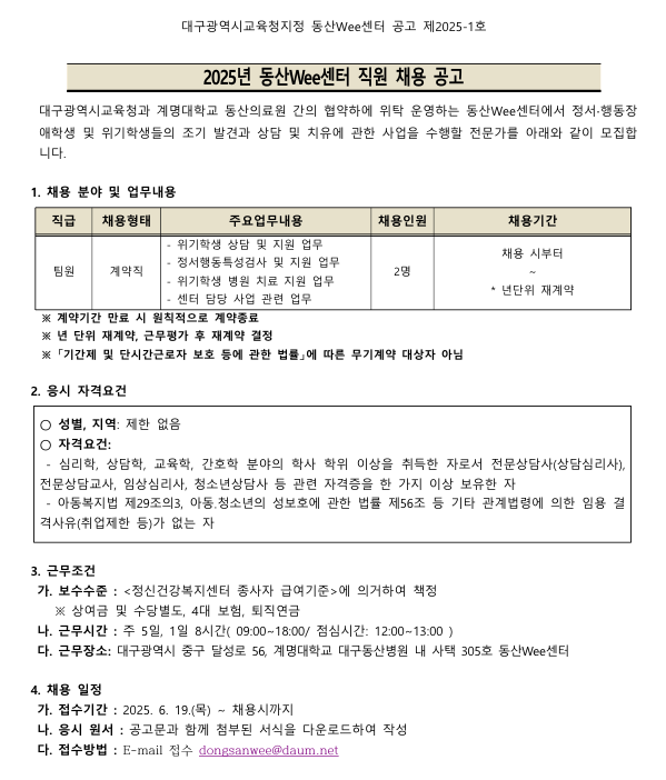 [채용] 제2025-1호 동산Wee센터 직원 채용 공고